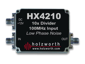 The Holzworth HX4210 100MHz 10x Frequency Divider is a high grade laboratory accessory. An emphasis was placed on maintaining the low jitter and phase noise of an external reference or frequency source to maintain the integrity of system timing and noise.