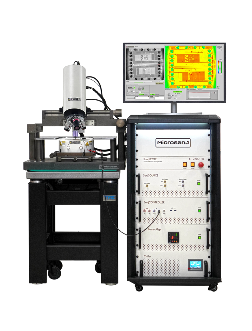 The SanjSCOPE™ NT220 is Microsanj’s flagship thermoreflectance imaging system, delivering sub-micron spatial resolution and nanosecond-scale transient thermal analysis. Designed for semiconductor failure analysis, RF device characterization, and advanced materials research, the NT220 offers unmatched precision and speed for identifying and analyzing thermal behavior at the microscale.